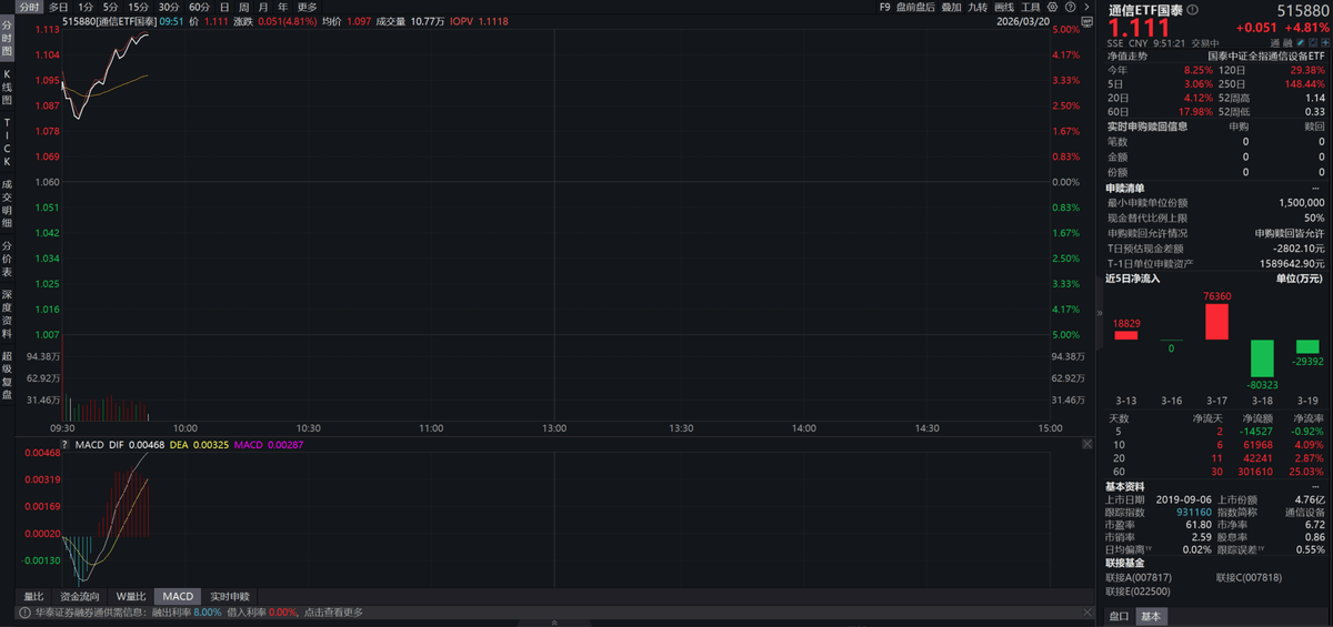 通信ETF国泰规模为153.23亿,AI财产链价值正正在传导。可插拔光模块生命力仍然兴旺。英伟达赐与2025-2027年AI算力芯片累计营收至多1万亿美元,3月20日盘中,